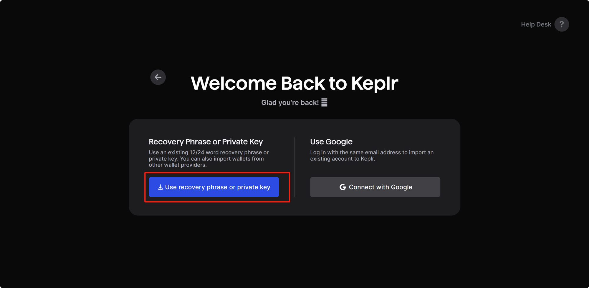 Use Recovery Phrase or Private Key to Import Keys into Keplr Wallet: